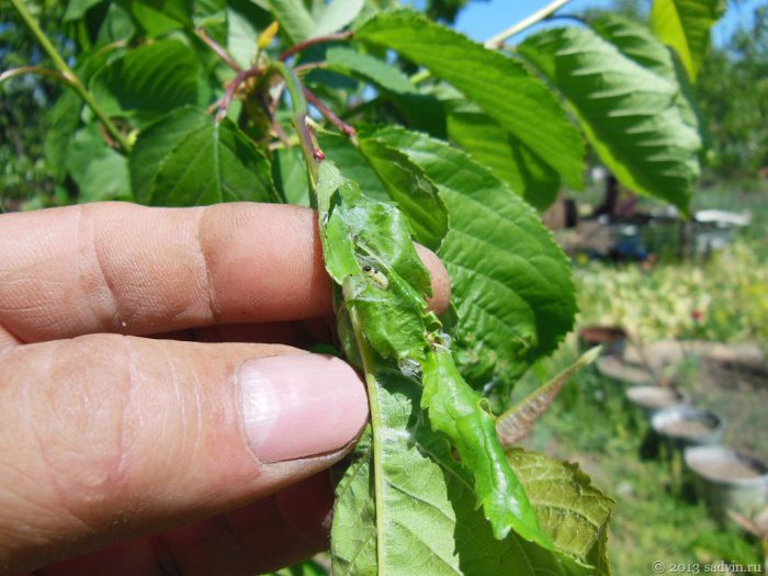 największym zagrożeniem dla wiśni i wiśni jest babka jabłkowa i mszyca Czarna wiśnia. Larwy takich szkodników wysysają sok roślinny z płytek liściowych, w wyniku czego zatrzymuje się wzrost żyły centralnej, a także obserwuje się zwijanie, suszenie i czernienie samego liścia. Młode drzewa dotknięte mszycami wykazują deformację i spadek wzrostu, te rośliny, które już zaczęły owocować, nie zakładają pąków kwiatowych, a jakość jagód jest znacznie zmniejszona. Na powierzchni liści pojawia się warstwa PADI (słodkie i lepkie odchody szkodników), na której woli osiedlać się sadzy. Na początku okresu wiosennego drzewo należy spryskać śpiącymi pąkami Konfidorem, po pół miesiąca przeprowadza się ponowne przetwarzanie. Taki szkodnik można zwalczać nieszkodliwymi środkami roślinnymi, które różnią się właściwościami owadobójczymi. Na przykład możesz użyć następującego rozwiązania: na 1 wiadro wody pobiera się 200 gramów pyłu tytoniowego i niewielką ilość mydła w płynie.