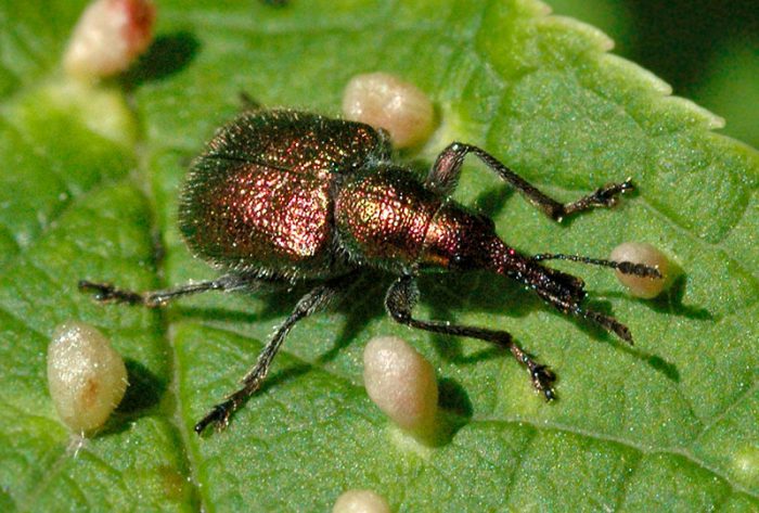 trąbka wiśniowa może zaszkodzić wszelkim roślinom pestkowym, w tym wiśniom i wiśniom. Larwy tego owada jedzą jądra znajdujące się w kościach, a miąższ jagód jest również uszkodzony. Aby pozbyć się takiego szkodnika, drzewo będzie musiało zostać przetworzone 2 razy. Gdy roślina zniknie, należy ją spryskać roztworem Aktary (na 1 wiadro wody 1,5 grama), po pół miesiąca przeprowadza się kolejną obróbkę, używając do tego karbofosu, nausznika, Aktelliku, Korsarza lub Metafoks.