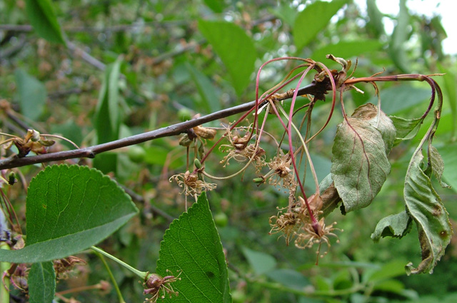 plamistość dziur, zwana także kleisterosporiozą, uszkadza łodygi, gałęzie, płytki liściowe, kwiaty i pąki rośliny. Na powierzchni liści pojawiają się plamy ciemnobrązowego koloru z obrzeżem ciemniejszego odcienia. W miejscu plam tkanina liści jest pomalowana i pojawiają się dziury. Dotknięte liście latają przed terminem. Na dotkniętych chorobą łodygach obserwuje się obumieranie tkanek, gumę, a jagody wysychają. Zainfekowane części rośliny należy usunąć, podczas gdy miejsca cięcia są czyszczone i dezynfekowane roztworem siarczanu miedzi (1%), a następnie są one 3 razy wcierane w liście szczawiu z dziesięciominutową przerwą między sesjami. A na samym końcu są pomijane przez var ogrodowy. Przed otwarciem pąków należy potraktować obszar Nitrafenem lub roztworem siarczanu miedzi (1%). Po kwitnieniu wiśni przeprowadza się drugie spryskiwanie roztworem mieszanki Bordeaux (1%). Następne leczenie przeprowadza się 15-20 dni po drugim, a ostatni raz miejsce z wiśniami opryskuje się nie później niż 20 dni przed zbiorem owoców.
