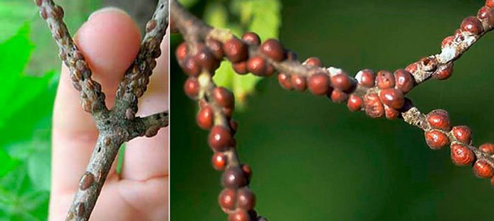 Tarcza może uszkodzić każdą naziemną część brzoskwini. 24 godziny po zassaniu skórki do drzewa na powierzchni owoców i kory tworzą się czerwone plamy. Szkodniki osiedlają się na górnych częściach pędów, na gałęziach szkieletowych i korze i przyczyniają się do wyczerpania rośliny. W wyniku życiowej aktywności łusek obserwuje się pękanie i obumieranie kory drzewa brzoskwiniowego, wysychanie wzrostów, mielenie i deformację owoców, a liście krążą przed czasem. Aby zniszczyć takie szkodniki, roślinę należy spryskać Aktara, Inta-vir, Actellik, Bankol lub Mospilan (postępuj zgodnie z instrukcjami dołączonymi do leku). Często stosuje się również wodę cebulową lub nalewkę pieprzową, ale takie środki ludowe są mało skuteczne.