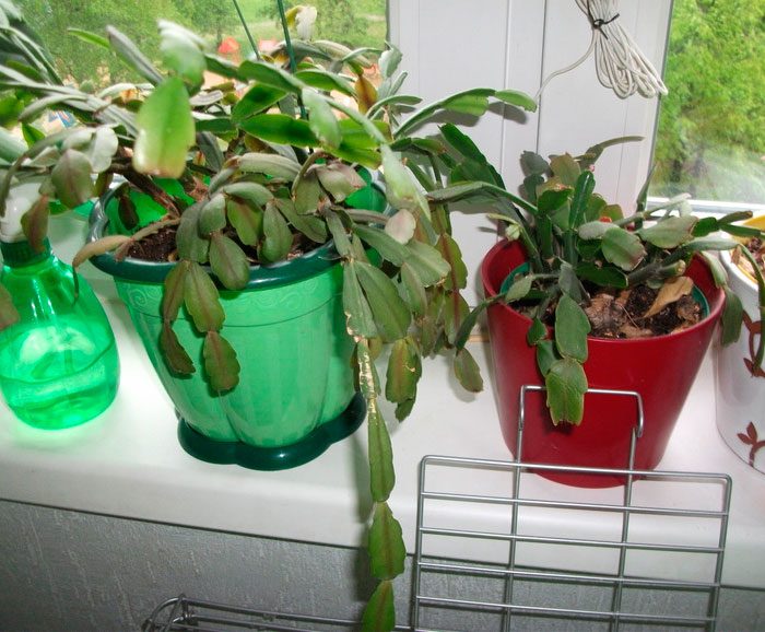 - obumieranie i oblatanie segmentów . W niektórych przypadkach liście pozornie idealnego zdrowego krzewu mogą zacząć umierać i opadać. Najczęściej obumieranie segmentów wynika z faktu, że przędziorek osiadł na krzaku. W przypadku, gdy szkodnik nie został znaleziony, "opadanie liści" może być związane z brakiem składników odżywczych(zbyt słabe podłoże lub bardzo rzadkie nawożenie). W takim przypadku krzew należy karmić 1-2 razy na liściu roztworem nawozu dla kaktusów epifitycznych, a następnie nakłada się go na podłoże. Jeśli nawet po takim opatrunku opadanie segmentów będzie kontynuowane, będziesz musiał przesadzić roślinę do świeżej mieszanki gleby. Jeśli przelatują końcowe segmenty, przyczyną tego może być zbyt niska wilgotność powietrza lub stres (zmiana środowiska, gwałtowne wahania dziennych temperatur, przedwczesny przeszczep lub przeciąg).