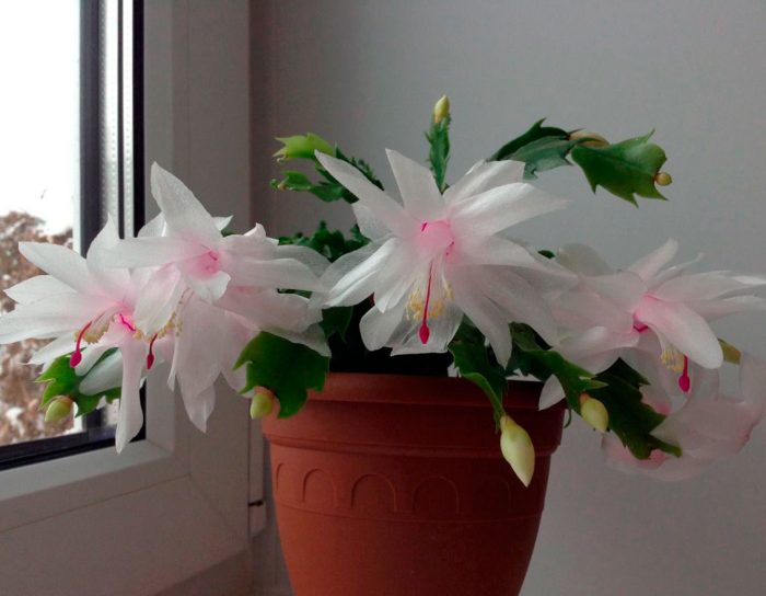 dekabrysta odmiany "biały" wygląda bardzo delikatnie i jednocześnie elegancko. Zwykle taka roślina kwitnie obficie. Czasami pod pąkami nie widać łodyg i liści. Kwiaty "Białego" są duże.