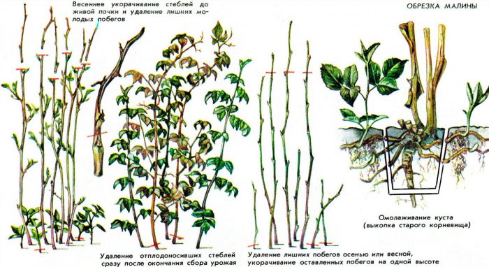 wiosną wszystkie łodygi dotknięte mrozem powinny zostać przycięte do zdrowych pąków w malinach, a także konieczne jest wycięcie rannych, dotkniętych chorobą i słabo rozwiniętych gałęzi. Jeśli przestrzegasz zasad techniki rolniczej tej kultury, wówczas na 1 metr bieżący działki powinno być 10-15 pędów. W związku z tym wszystkie pędy należy wyciąć na krzaku, pozostawiając tylko te, które najpierw zaczęły rosnąć, należy je skrócić o 15-20 centymetrów. W wyniku takiego przerzedzającego przycinania poprawi się jakość owoców, a także będą one większe. Takie przycinanie można wykonać w razie potrzeby jesienią, ale wraz z nadejściem wiosny w krzakach konieczne będzie wycięcie wszystkich łodyg uszkodzonych i uszkodzonych przez mróz. I według I. V. Kozakova krzewy przycięte wiosną dadzą bogatsze zbiory.