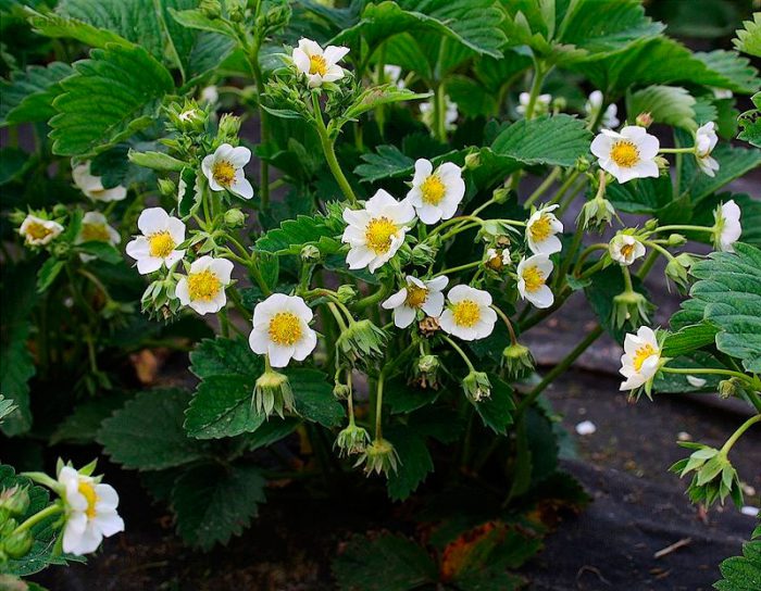 taka roślina zaczyna kwitnąć w połowie maja. Jeśli w okresie kwitnienia truskawki są odpowiednio pielęgnowane, wpłynie to pozytywnie na jakość i ilość plonu. Kiedy zacznie kwitnąć, nawóz zawierający potas, a także popiół drzewny i próchnicę należy wprowadzić do gleby. Aby zbiory były bardziej obfite, krzewy należy traktować roztworem kwasu borowego (1 mała łyżka na 1 wiadro wody), dzięki czemu jajniki staną się znacznie większe. W tym czasie konieczne jest terminowe pielenie, a także rozluźnienie powierzchni gleby, ponieważ skorupa, która pojawiła się na jej powierzchni, nie pozwoli korzeniom w pełni oddychać. Zanim dojrzeją pierwsze jagody, powierzchnia gleby w pobliżu roślin musi być pokryta warstwą ściółki. Aby zbiory były jak najbardziej obfite, w tym czasie za pomocą sekatora z krzaków należy usunąć nadmiar wąsów i płyt liściowych.