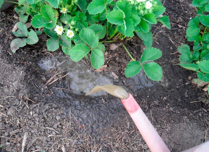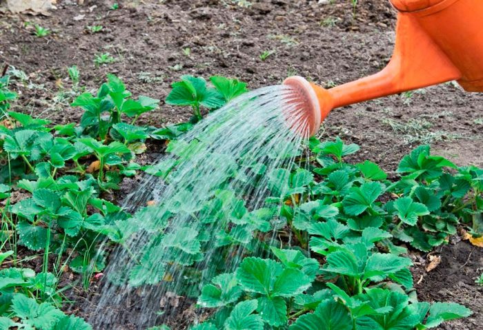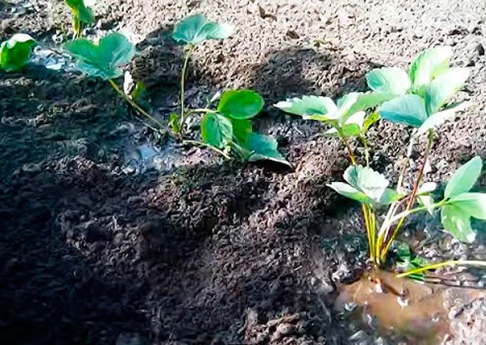 aby jagody były duże, truskawki będą wymagały obfitego podlewania. Należy jednak pamiętać, że należy go podlewać, aby woda nie stagnowała w korzeniach. Pamiętaj, że z powodu niewystarczającego podlewania cierpi system powierzchniowy korzeni krzewów, a raczej wysycha. Jeśli jest zbyt dużo wody, na systemie korzeniowym rozwinie się zgnilizna korzeni lub szarości. Rozpoczęcie podlewania truskawek przypada na ostatnie dni kwietnia. Na 1 m 2 powinien wynosić średnio od 10 do 12 litrów wody. Nie musi być zimno. Jeśli jest umiarkowanie gorąca pogoda, wystarczy podlać truskawki 1 raz na 10-12 dni. W upalne lato taka kultura musi być podlewana częściej ― 3 lub 4 razy w ciągu 7 dni. Od sierpnia do października (włącznie) w porze suchej rośliny należy podlewać kilka razy w ciągu 7 dni. Zaleca się wykonanie tej procedury rano, podczas gdy woda powinna być nalewana bardzo ostrożnie, ponieważ jej krople nie powinny znajdować się na powierzchni kwiatostanów lub płytek liściowych. Dopóki łodygi kwiatowe nie rosną, najlepiej podlewać truskawki przez zraszanie, a podczas kwitnienia krzewów idealnie nadają się do nawadniania kroplowego.