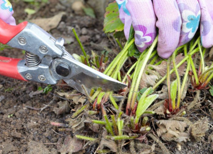 konieczne jest cięcie liści bardzo ostrymi nożyczkami lub sekatorami. Jednak cięcie płyty liściowej" pod korzeniem " nie jest konieczne, konieczne jest, aby pędy i sadzonki pozostały na krzaku, których długość powinna osiągnąć 10 centymetrów. Wytnij tylko liście i niepotrzebne rozety. Konieczne jest również wykopanie młodych rosnących wąsów, aby szybko zbudowały system korzeniowy. W przypadku, gdy nie zamierzasz rozmnażać truskawek za pomocą wąsów, musisz je wszystkie usunąć, co pozwoli uniknąć zagęszczenia łóżek.