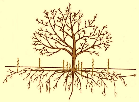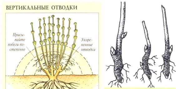 u młodych okazów dolne gałęzie są skracane jesienią, podczas gdy powinny pozostać od 2 do 4 pąków. Jego pień jest poddawany wysokiemu hillingowi. Pędy powinny rosnąć z pąków znajdujących się pod ziemią wiosną, gdy ich wysokość wynosi 8-10 centymetrów, należy ponownie hilling na wysokość od 40 do 50 milimetrów. Po wysokości pędów wynosi 0,2-0,3 metra, należy je wykopać i przeciągnąć drutem miedzianym u podstawy. Następnie pędy są ponownie hilling na 1/3 ich wysokości. Pół miesiąca później są ponownie hillingowane. Jesienią warstwy są wykopywane, odcinane od krzewu macierzystego i sadzone natychmiast w stałym miejscu.