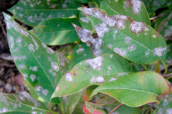 jeśli latem jest wilgotna, chłodna pogoda, istnieje duże prawdopodobieństwo rozwoju szarej zgnilizny. U dotkniętego okazu na płytkach liściowych powstają duże plamy brązowego koloru rozmytych konturów. Takie plamy bardzo szybko rosną, a tkanina znajdująca się w ich środku pęka i wysycha. Zainfekowane owoce są zabarwione na brązowo, grzybnia wyrasta przez nie. Jesienią musisz koniecznie zgarnąć wszystkie latające liście i owoce i zniszczyć je. Następnie roślinę spryskuje się preparatem Vectra.