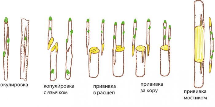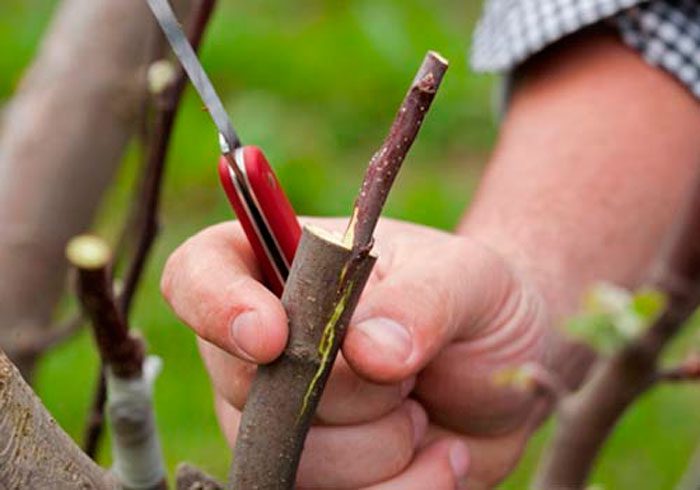 - szczepienie "w dekolcie" . Skróć podkładkę, wykonując poziome cięcie. Trzon podkładki należy podzielić na środek cięcia na głębokość od 40 do 50 mm.w powstałym cięciu należy na chwilę zainstalować klin. Na sadzonce zrazu powinno być od 2 do 4 pąków, jego cięcie należy wykonać po obu stronach klinem o długości od 40 do 50 mm.klin zrazu należy włożyć do podziału podkładki. Następnie należy ostrożnie wyciągnąć tymczasowy klin z podziału. Miejsce szczepienia jest ciasno owinięte folią. Cięcie zrazu znajdującego się na górze i otwarty obszar cięcia podkładki należy pokryć varem ogrodowym.