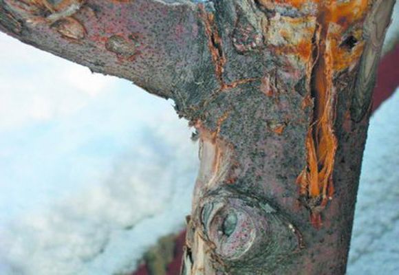 zgnilizna łodygi lub cytosporoza. Choroba ta jest szczególnie niebezpieczna dla drzew, które są stare lub osłabione, mają oparzenia od mrozu lub słońca, wyczerpane brakiem wilgoci lub niewłaściwą opieką. W dotkniętych okazach kora z czasem staje się ciemnoczerwona, a samo drzewo wysycha. Po wykryciu choroby konieczne jest wycięcie wszystkich dotkniętych obszarów ostrym nożem, a następnie rany należy posmarować varem ogrodowym lub spryskać roztworem siarczanu miedzi. Jesienią wypaczanie gałęzi szkieletowych i pień gruszki należy wybielić wapnem. Wszystkie dotknięte gałęzie należy wyciąć i spalić.