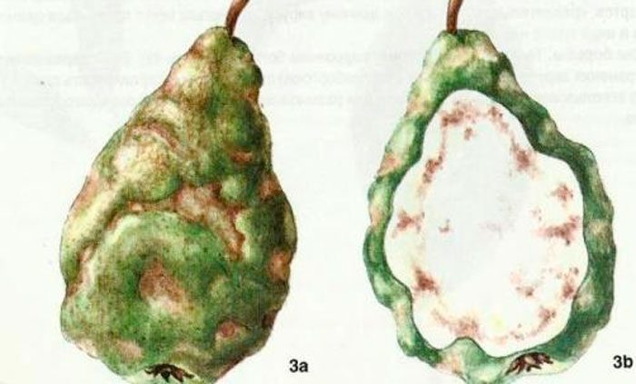 jeśli w miąższu owoców pojawiły się bez smaku twarde formacje, oznacza to, że roślina jest zainfekowana podskórną plamistością wirusową. W miejscach takich formacji następuje zatrzymanie rozwoju płodu, pojawiają się wgniecenia, przez co owoc staje się brzydki. Liczba owoców zmniejsza się i pogarsza ich jakość, kolor płytek liściowych staje się mozaiką, na korze powstają pęknięcia. Zwiększa się prawdopodobieństwo zamarznięcia roślin osłabionych chorobą zimą. Gruszka może zostać zainfekowana podczas przycinania lub podczas szczepienia, jeśli użyto niesterylnych brudnych narzędzi. Również nosicielami choroby są ssące szkodniki owadów. W celu zapobiegania należy zapobiegać pojawianiu się szkodników na roślinie, dobrze sprawdzić zakupioną sadzonkę, szczepienie i przycinanie należy przeprowadzić tylko za pomocą dobrze zdezynfekowanego narzędzia.
