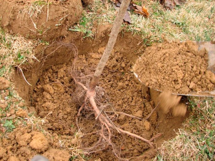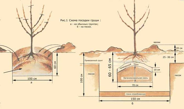 jeśli gleba na stronie nadaje się do uprawy tej uprawy, otwór do sadzenia nie powinien być bardzo duży. Powinien nieznacznie przekraczać wartość systemu korzeniowego rośliny. Jeśli jednak gleba nie nadaje się do sadzenia gruszki, wielkość otworu do sadzenia powinna wynosić 0,7 x 0,7 m,a jego głębokość powinna wynosić około 1 metra. Przygotowanie dołu należy wykonać 20-30 dni przed sadzeniem, w tym czasie gleba dobrze się w nim osiądzie. Przygotowany wcześniej mocny kołek należy wbić w środek gotowego dołu, podczas gdy powyżej powierzchni witryny powinien unosić się co najmniej 50 centymetrów. Podczas kopania wykopu górną warstwę odżywczą gleby należy odrzucić osobno. Łączy się go z 30 kilogramami torfu, kompostu lub zgniłego obornika, dodaje się do niego 1,5 kilograma wapna, 1 kilogram superfosfatu, a także 0,1 kilograma chlorku potasu. Połowę dobrze wymieszanej mieszanki gleby należy wlać do dołu, jest ona wyciszona. Pozostałą część należy zalać kopcem w pobliżu kołka.