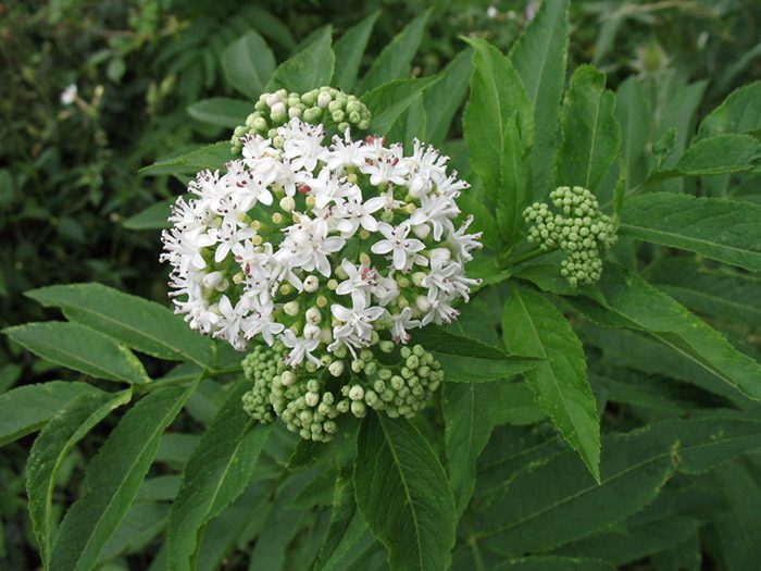 ta roślina jest ozdobna. W warunkach naturalnych można go spotkać na terytorium Ameryki Północnej, podczas gdy woli rosnąć na górskich pastwiskach i wzdłuż brzegów rzek i strumieni. U tego gatunku wysokość drzew nie przekracza 15 metrów. Czasami są też krzewy o cienkich gałęziach, które w młodym wieku mają czerwony kolor. Kolor pni jest jasnobrązowy. Skład płyt liściowych obejmuje od 5 do 7 gruboziarnistych zielonkawo-niebieskich liści, które osiągają długość około 15 centymetrów. Średnica kwiatostanów corymbose wynosi około 15 centymetrów, składają się z pachnących kwiatów o kremowym kolorze. Kwitnienie trwa około 20 dni. Owoce mają spektakularny wygląd, ich kształt jest kulisty, a kolor jest niebiesko-czarny, ponieważ na powierzchni jagód znajduje się niebieskawa powłoka. Odporność na zimę tego gatunku jest poniżej średniej.