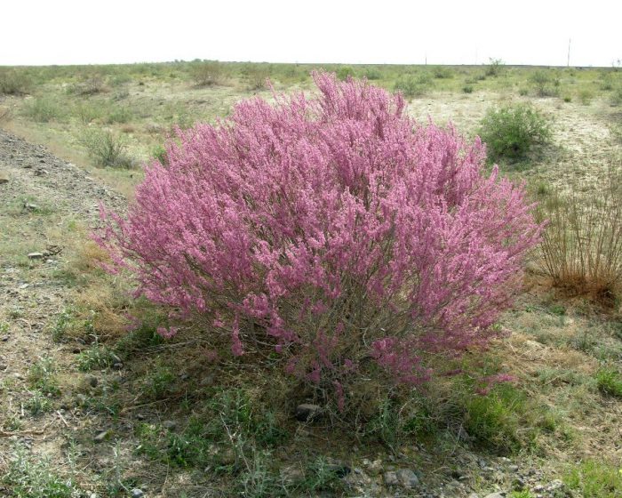 w warunkach naturalnych taka roślina występuje w północno-zachodnich Chinach, północnym Iranie, Mongolii, Afganistanie i dolnej części Wołgi. Gatunek ten jest reprezentowany przez rozgałęziony duży krzew lub małe drzewo, jego wysokość wynosi około 5 metrów. Nagie rozłożyste gałęzie są pomalowane na niebiesko lub zielono. Bezpośrednio osadzone płytki liściowe o owalnym rombowym lub jajowatym kształcie zwężają się do podstawy i wyostrzają do góry. Wiechy wierzchołkowe tworzą bujne kwiatostany racemose, składające się z różowych kwiatów. Taka roślina kwitnie przez około 8 tygodni. Gatunek ten wyróżnia się odpornością na suszę i mróz, nie jest wymagający dla gleby i normalnie toleruje jej zasolenie.