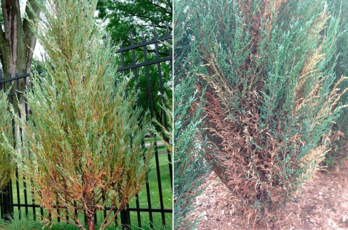 również jałowiec może stracić swój spektakularny wygląd, a nawet umrzeć z powodu choroby zwanej wysychaniem gałęzi. Aby zrozumieć, że krzew jest zainfekowany wiosną, jego igły stają się żółte i zaczynają umierać, na początku wpływa to na niezbyt duże obszary, ale z czasem choroba rozprzestrzenia się na cały jałowiec lub większość. W miarę rozwoju choroby małe owocniki grzybów tworzą się na powierzchni kory i igieł. Chory krzew należy natychmiast rozpocząć leczenie, ponieważ zaobserwowano pierwsze oznaki wysychania gałęzi. Aby to zrobić, odetnij wszystkie gałęzie żółtymi igłami, a sama roślina musi być traktowana roztworem fungicydu. W przypadku, gdy jałowiec jest bardzo dotknięty chorobą, będzie musiał zostać wykopany i zniszczony. W celu zapobiegania konieczne jest spryskanie krzaka 2 razy w sezonie, a mianowicie: w drugiej połowie kwietnia i w ostatnich dniach października, w tym celu stosuje się Tilt, Ridomil Gold MC lub SCOR.