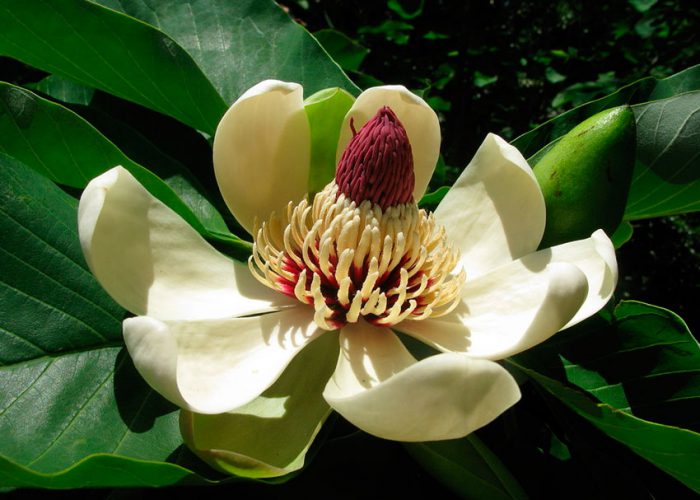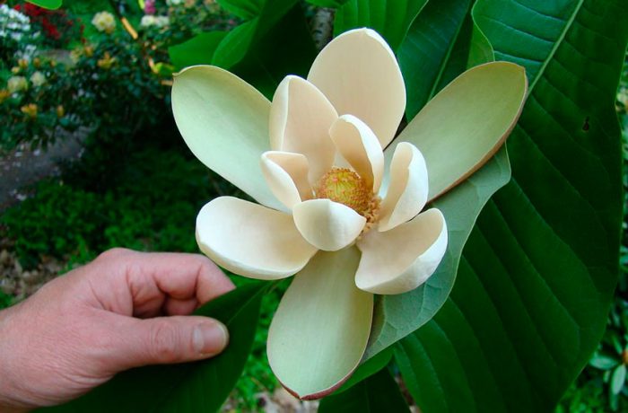 ten gatunek pochodzi z Japonii i wyspy Kunashir, która znajduje się na Kurylach. Wysokość tego liściastego drzewa wynosi około 15 metrów. Kolor gładkiej kory jest szary. Na końcach łodyg zbierane są płytki liściowe po 8-10 sztuk. Średnica spektakularnych biało-kremowych kwiatów wynosi około 16 centymetrów, wyróżniają się tym, że mają ostry zapach. Długość nasyconych czerwonych owoców wynosi około 20 centymetrów. Taka roślina wygląda spektakularnie przez cały rok, jest odporna na Cień i mrozoodporna, ale jednocześnie wymaga poziomu wilgotności powietrza i gleby. Uprawiana od 1865 r.