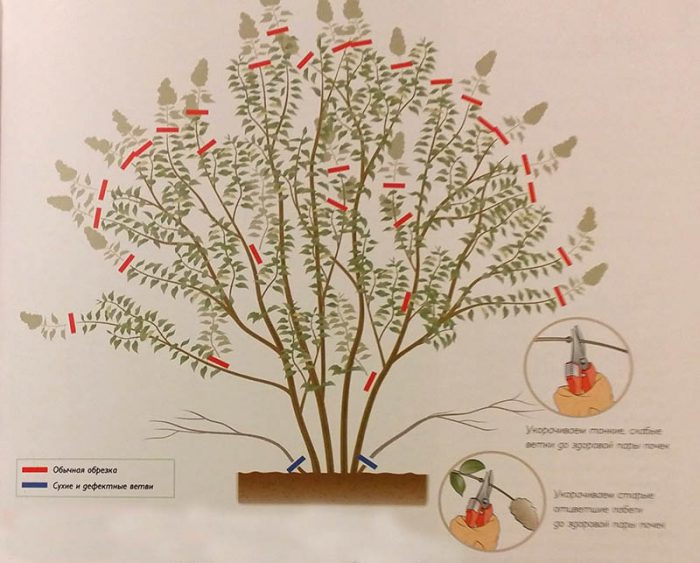 wczesną wiosną, zanim pąki puchną, musisz wykonać przycinanie sanitarne. Aby to zrobić, odetnij wszystkie zranione, uszkodzone przez chorobę, szkodniki lub mróz, a także wysuszone i osłabione gałęzie. Aby zachować blask i zwartość krzewów, należy je wyciąć po ich kwitnieniu lub jesienią. Jednocześnie pamiętaj, że układanie pąków kwiatowych odbywa się na zeszłorocznych pędach, więc należy je skrócić nie więcej niż ½ części. Jeśli roślina jest już bardzo stara, w razie potrzeby można wykonać przycinanie przeciwstarzeniowe, które roślina toleruje bardzo dobrze.