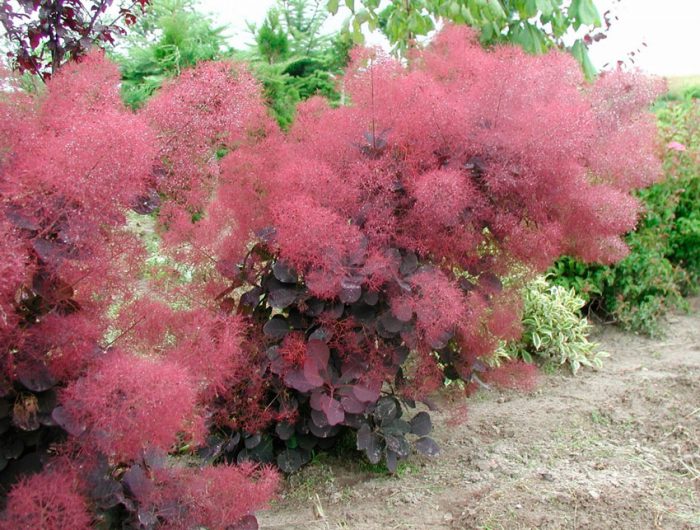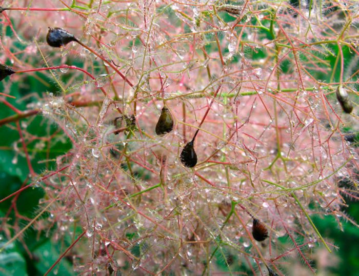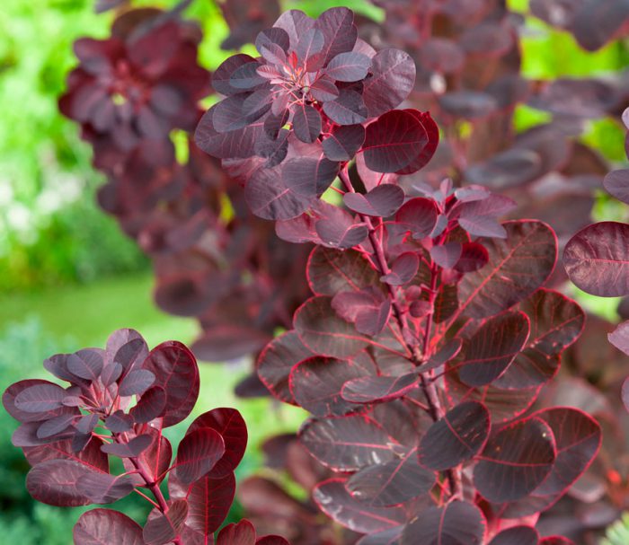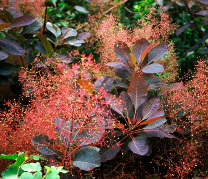 - Scumpia purpurea (purpurea) . Wysokość rośliny wynosi około 7-8 metrów. Jego wiechy kwiatowe i płytki liściowe są pomalowane na fioletowo i mają pokwitanie.