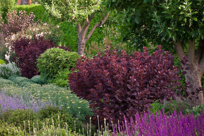 - Royal Perple . Ta odmiana charakteryzuje się powolnym wzrostem. Jego wysokość może osiągnąć 150 centymetrów. Rozłożysta Korona ma zaokrąglony kształt. Duże płytki liściowe w lecie są pomalowane na brązowo-czerwony kolor, jesienią mają Jasnoniebieski metaliczny odcień. Czerwone kwiaty mają srebrny połysk. Żywotność rośliny wynosi około 70 lat.