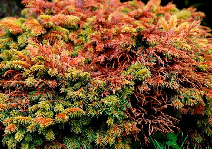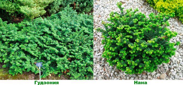 - Hudsonia . Ta górska roślina karłowata ma bardzo gęste gałęzie, szeroką koronę i wiele krótkich łodyg. Krótkie igły są szerokie i mają płaski kształt, ich przednia powierzchnia jest zielono-czarna, a niewłaściwa — niebieskawo-Zielona. Uprawiana od 1810 r.