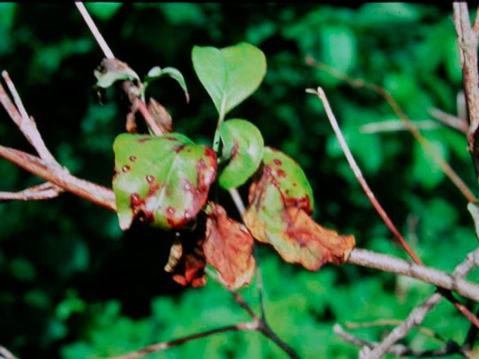 - Dereń Mitcha . Na powierzchni jasnożółtych blaszek liściowych znajdują się małe plamki.