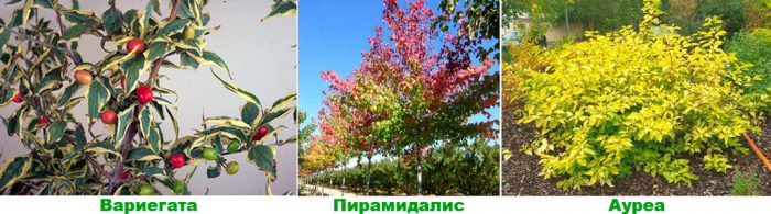 - Variegata . Krzew osiąga wysokość 4 metrów. Barwne płytki liściowe mają żółty kolor. Jasnozielone młode łodygi z czasem zmieniają kolor na bordowy. Jagody są niebiesko-czarne.
