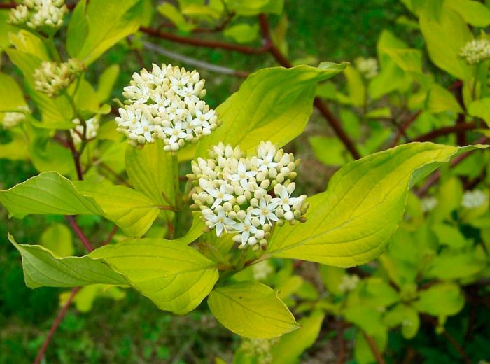 - Sibirica Aurea . Wysokość krzewu może wynosić od 1,5 do 2 metrów. Na wyprostowanych łodygach koloru czerwonego znajdują się jasnożółte płytki liściowe. Kwiatuszki biało-kremowe. Kiedy bladoniebieskie owoce zaczynają dojrzewać, może rozpocząć się ponowne kwitnienie.