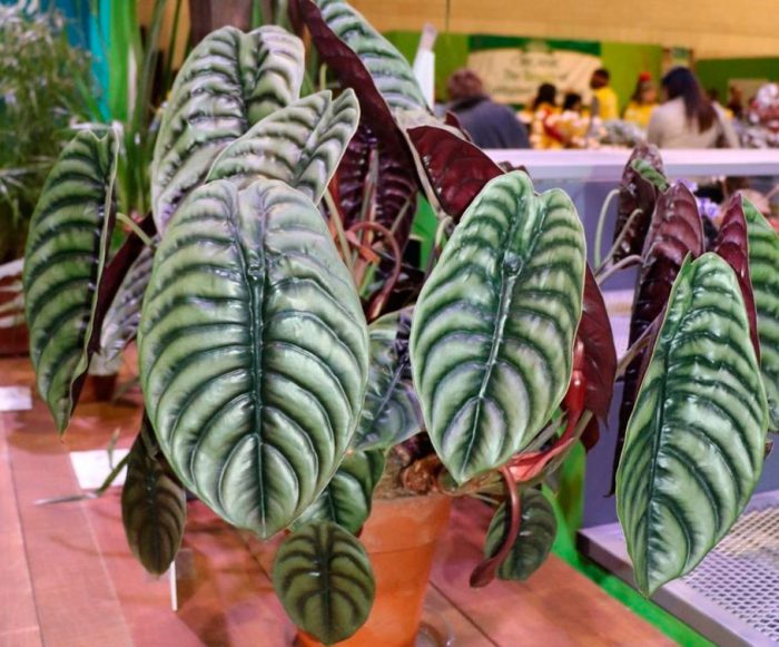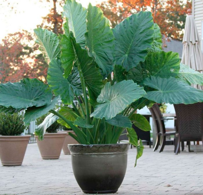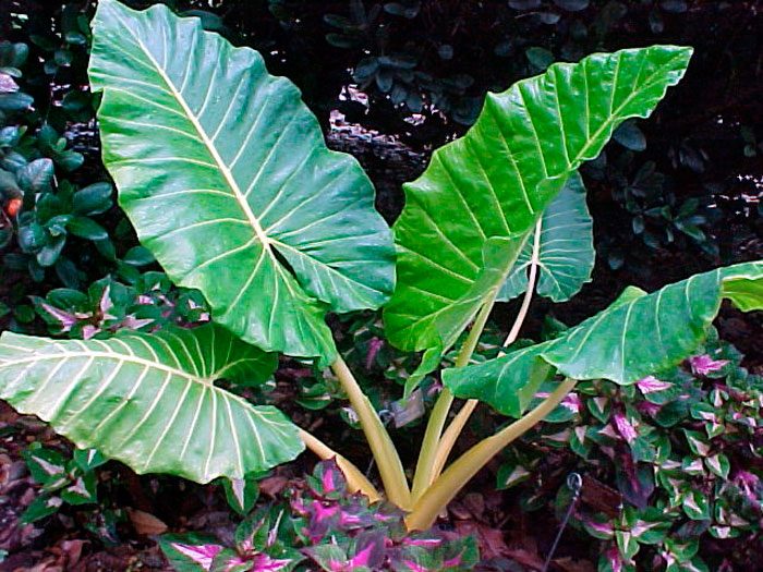 lub alocasia indica (Alocasia indica). Długość pnia osiąga około dwóch metrów, odchodzą od niego długie ogonki (około 100 cm), na których rosną płytki liściowe. W liściach w kształcie serca podstawa jest podzielona na płaty, ich długość wynosi około 100 cm, a szerokość jest nieco mniejsza. W domu kwiaty powstają bardzo rzadko. Podczas kwitnienia rośnie szypułka o długości około 30 centymetrów. I na nim powstaje dwudziestocentymetrowa długość kolby, która jest pokryta zielonkawo-żółtą osłoną tej samej wielkości.