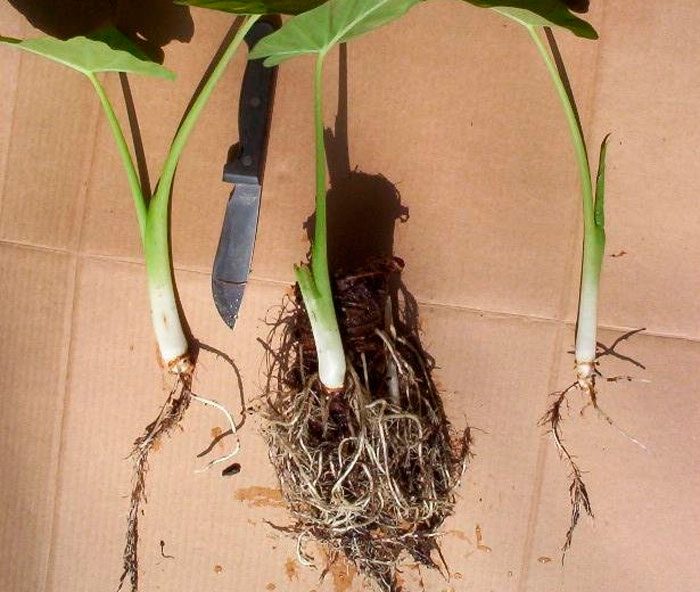 Alocasia może być rozmnażana przez różne części krzewu. Jednak niezależnie od tego, którą część wybierzesz, na kłączu lub sadzonce miejsca cięcia są koniecznie traktowane rozdrobnionym węglem drzewnym. Do ukorzenienia sadzi się je w podłożu, które obejmuje torf i piasek (1:1). Pojemnik, w którym posadzono część krzewu, należy przykryć folią, torbą lub szkłem, zapewnia systematyczne podlewanie i wentylację. Aby ukorzenienie zakończyło się powodzeniem, temperaturę powietrza należy utrzymywać na poziomie od 22 do 24 stopni. Kiedy pojawią się pierwsze kiełki, krzew jest przesadzany do tymczasowego pojemnika, a po tym, jak stanie się silniejszy i odrosną korzenie, jest przenoszony do stałej doniczki.