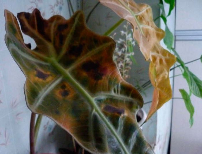 - choroby . Alocasia może zachorować tylko wtedy, gdy jest niewłaściwie pielęgnowana lub utrzymywana w nieodpowiednich warunkach.