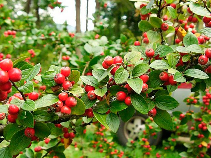 ten krzew ma związek z gatunkami rozpostartymi. Wysokość takiej wiecznie zielonej rośliny wynosi około 100 centymetrów, a jej korona może osiągnąć szerokość 150-200 centymetrów. Łodygi są umieszczone w warstwach, takich jak grzbiet ryby. Błyszczące zielone płytki liściowe o zaokrąglonym kształcie zmieniają kolor na ognisty czerwony jesienią. Małe białawo-różowe kwiaty ujawniają się w ostatnich dniach maja. Kwitnienie trwa około 20 dni. Na krzaku pojawia się wiele szkarłatnych owoców, które dojrzewają w pełni we wrześniu. W niektórych przypadkach nie spadną do następnej wiosny. Ten typ ma specjalne wymagania dotyczące jakości i składu gleby. Uprawiana od 1880 r. istnieje kilka odmian: