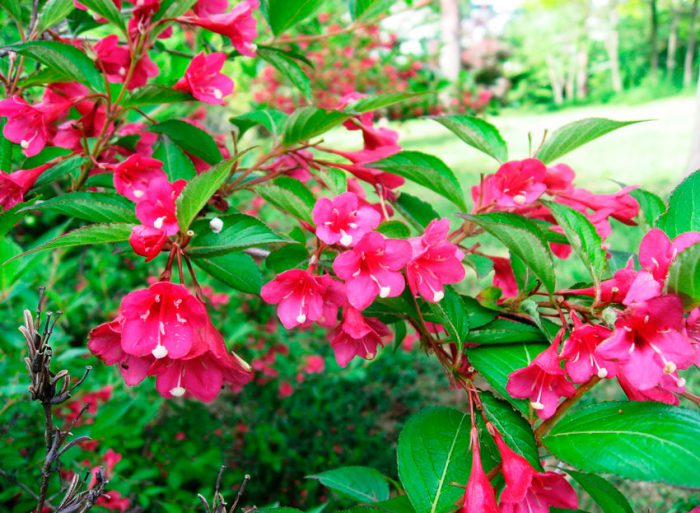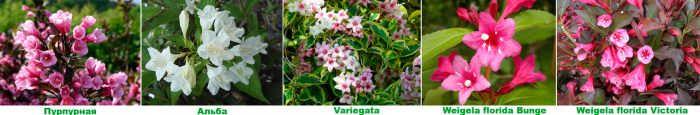 dość często ogrodnicy uprawiają obficie kwitnącą weigelę, przyjemną weigelę, wczesną weigelę, japońską weigelę, ogrodową weigelę, Maximovich Weigelę i koreańską weigelę.