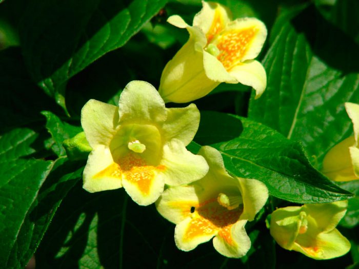 wysokość krzewu może wynosić od 100 do 150 centymetrów. Pędy rosnące. Duże (od 3 do 4 centymetrów) żółte kwiaty mają pomarańczowe plamy w gardle. Są częścią kwiatostanów o małych kwiatostanach po 2-6 sztuk lub są pojedyncze. Kwitnienie obserwuje się dwa razy w sezonie.