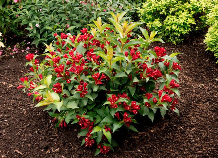 jeśli sadzonka Weigela średniej wielkości (nie wyższa niż 100 centymetrów), odległość między krzakami powinna wynosić co najmniej 80 centymetrów, odstępy między krzewami wysokich odmian (wysokość do 250 centymetrów) powinny wynosić od 150 do 200 centymetrów. Podczas sadzenia nie zapomnij wyprostować korzeni sadzonki, gleba będzie musiała być stopniowo wlewana do dołu i ubijana, aby wyeliminować możliwość powstawania pustek. Możesz pogłębić szyjkę korzenia tylko o 10-20 mm, ale pożądane jest, aby gdy gleba osiadła po podlaniu, była na tym samym poziomie co ziemia. Posadzona roślina musi być dobrze podlana, a powierzchnia gleby posypana warstwą ściółki.