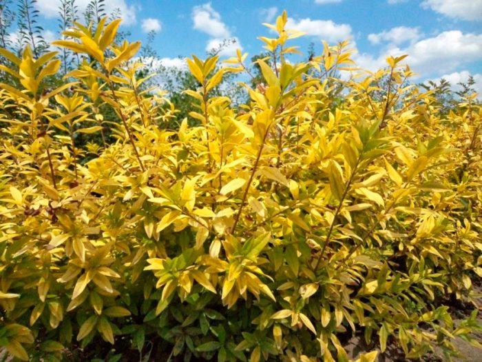 - wikariusz . Ta półzimozielona roślina może osiągnąć wysokość 100 centymetrów. Ma gęstą koronę składającą się z szeroko owalnych liści o żółto-złotym kolorze, a jesienią są pomalowane na brązowo-fioletowy odcień. Ich długość nie przekracza 6 centymetrów. Kwitnienie obserwuje się w połowie lata. Kwiaty są małe białe pachnące. Na zimę krzew musi być przykryty.
