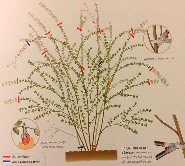podczas przycinania konieczne będzie odcięcie pędów dotkniętych chorobą lub szkodnikami, a także osłabionych, wysuszonych, a także tych, które przyczyniają się do zagęszczania. Jeśli gatunek jest dekoracyjny, po raz pierwszy należy go przyciąć wiosną po osiągnięciu wieku jednego roku. W takim przypadku należy odciąć 1/3 lub 2/3 części pędu. W kolejnych latach krzew jest przycinany 2 razy w roku, a mianowicie w pierwszych dniach czerwca i na początku sierpnia. Takie przycinanie jest zarówno sanitarne, jak i kształtujące. Te gatunki i odmiany, które są niewymiarowe, nie mogą być poddawane procedurze przycinania.
