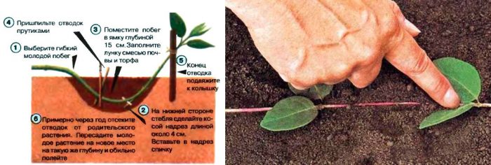 wiosną na krzaku wśród niższych gałęzi musisz wybrać wystarczająco mocną roczną łodygę. Następnie należy go docisnąć do powierzchni gleby i umieścić w płytkim (około 20 centymetrów) rowku, który należy wykonać z wyprzedzeniem. Napraw łodygę, po czym wypełnij rowek ziemią, podczas gdy tylko górna część pędu powinna pozostać na powierzchni gleby. Jesienią gotowe ukorzenione warstwy należy oddzielić od rośliny macierzystej i przesadzić do uprawy.