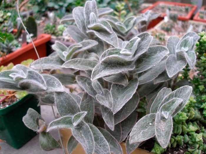 proste pędy zdobią długie płytki liściowe, na których powierzchni znajduje się pokwitanie białych włosów. Kolor kwiatów jest liliowo-różowy.