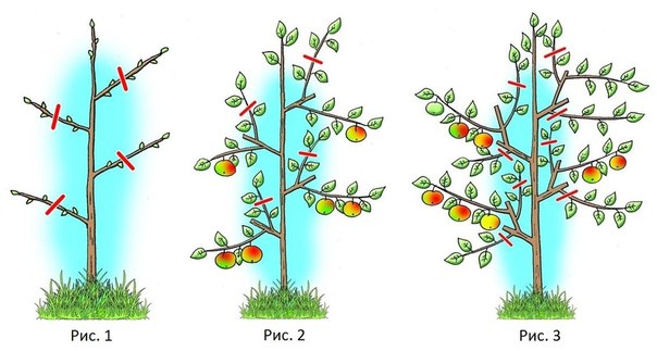 na początku okresu wiosennego drzewo pierwszego roku życia powinno odciąć wszystkie gałęzie boczne, aby na każdym z nich pozostały tylko 2 pąki. W ciągu następnych 2 lub 3 lat konieczne jest tworzenie ogniw owocowych z młodych pędów. Te pędy boczne, które nie są potrzebne, zaleca się ostrożne przycinanie, gdy są zielone. Faktem jest, że gojenie się ran na zdrewniałym pędzie trwa stosunkowo dłużej.