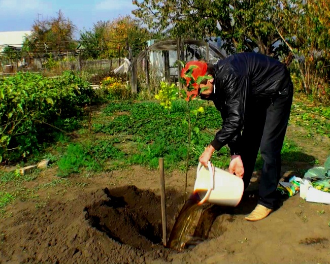 w procesie kopania dziury należy usunąć górną warstwę gleby, w której znajduje się większa ilość składników odżywczych oddzielnie od dolnej warstwy, zapobiegając ich mieszaniu. W przypadku, gdy gleba jest ciężka, na dnie dołu konieczne jest ułożenie warstwy żwiru zmieszanego z piaskiem w celu drenażu. Następnie do żyznej gleby należy wlać od 3 do 4 wiader humusu (kompostu), 100 gramów superfosfatu i od 50 do 100 gramów nawozu potasowego i wszystko wymieszać. Zaleca się również wlać od 100 do 200 gramów mąki dolomitowej do kwaśnej gleby. Tę glebę należy wlać do otworu do sadzenia i wyrównać jej powierzchnię. Pół miesiąca później gleba osiądzie i zagęści się.