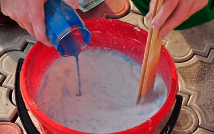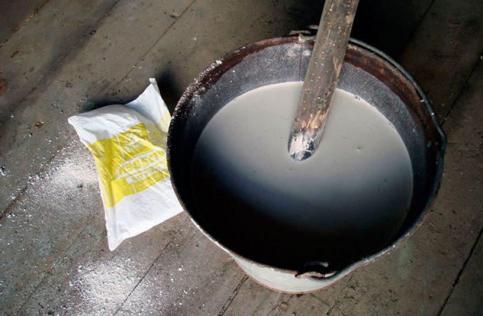 metoda gotowania : do pół wiadra wody dodaje się odpowiednią ilość kleju, a roztwór dokładnie miesza. Następnie należy stopniowo wlewać wapno gaszone, a także siarczan miedzi rozpuszczony w wodzie, która powinna być gorąca, podczas gdy roztwór należy stale mieszać. Następnie musisz stopniowo wlewać żółtą glinę, a także obornik. W rezultacie roztwór powinien mieć konsystencję śmietany.