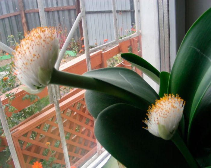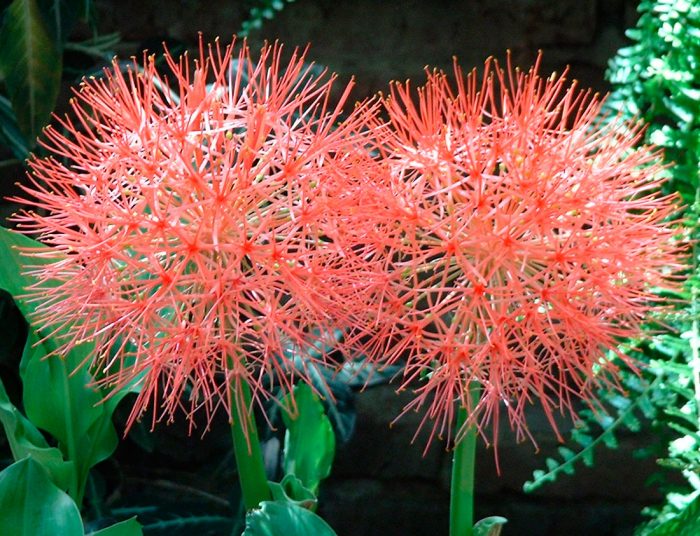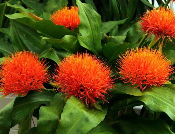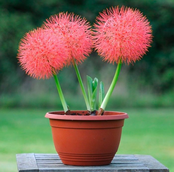 lub scadoxus multiflorus (Scadoxus multiflorus). Blaszki liściowe tego gatunku są żyłkowate. Na długich szypułkach powstają duże kwiatostany szarlachowoczerwonego lub jasnoróżowego odcienia.