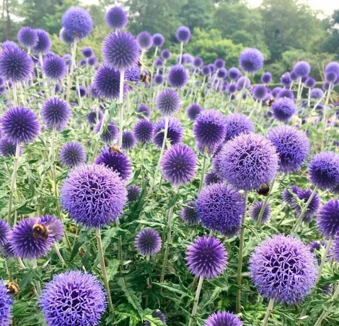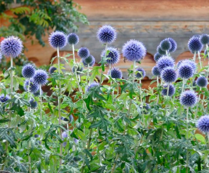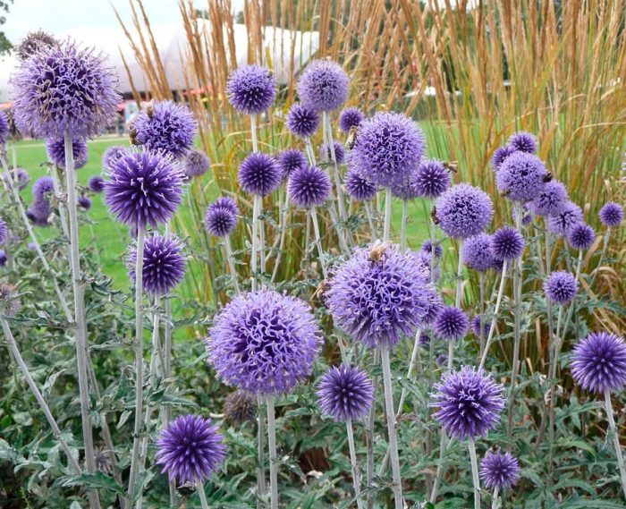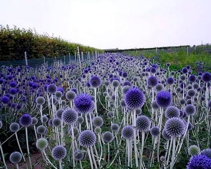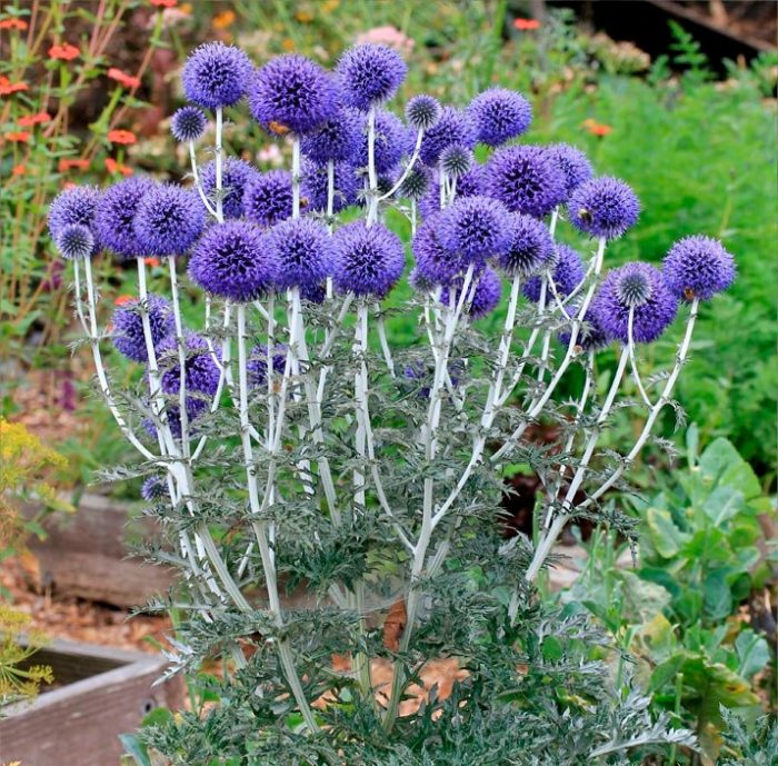 Krzaki kwitną w ostatnich wiosennych tygodniach. W tym czasie wznoszą się nad nim fioletowo-niebieskie lub nasycone niebieskie kwiatostany. Mają kształt kuli i wyglądają kłująco, ale w rzeczywistości kwiatostany są dość miękkie w dotyku. Ta odmiana jest często uprawiana jako roślina ozdobna.