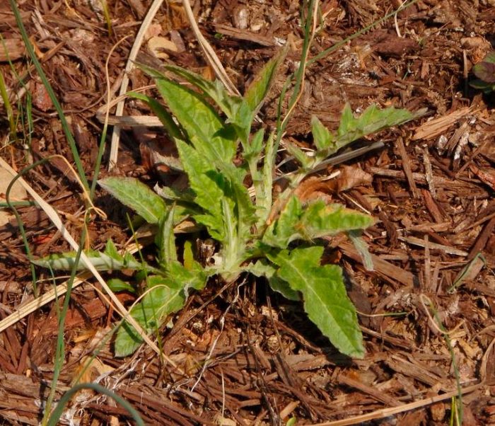 gładkie, siedzące płytki liściowe są pomalowane na ciemnozielony odcień. Ich krawędź jest ząbkowana, a kolce znajdują się na końcach. Liście są pierzaste szerokie i długie, a większość z nich znajduje się u podstawy krzewu.