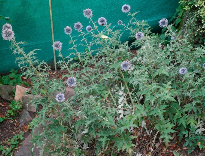 regularnie rozmieszczone długie płytki liściowe rosną na całej długości łodygi, na ich powierzchni znajdują się kolce. Krzew kwitnie w drugiej połowie lata, w związku z tym nie stanowi żadnej wartości dla pszczelarzy. W okresie kwitnienia powstają małe kuliste kwiatostany o średnicy dochodzącej do około 30 mm. w naturze kwiaty są pomalowane na niebiesko-fioletowy odcień. W tym samym czasie w ogrodzie najczęściej uprawiane są odmiany o kwiatach o niebieskim lub białym odcieniu.