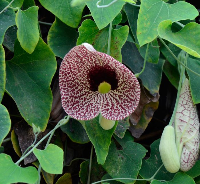 ta wiecznie zielona Liana pochodzi z tropików Ameryki Południowej. Płyty liściowe w kształcie serca mają dość duży rozmiar. Podczas kwitnienia krzew zdobią kwiaty podobne do małych rur gramofonowych. Ich szerokość waha się od 8 do 10 centymetrów, a ich długość może osiągnąć około 12 centymetrów. Kwiaty są białe, a ciemnobrązowe i ciemnoczerwone plamki zdobią je. Krzew kwitnie w lipcu, a kwitnie we wrześniu. Zapylanie odbywa się za pomocą much i innych owadów. Zamknięcie wejścia do kwiatu następuje po zapyleniu.