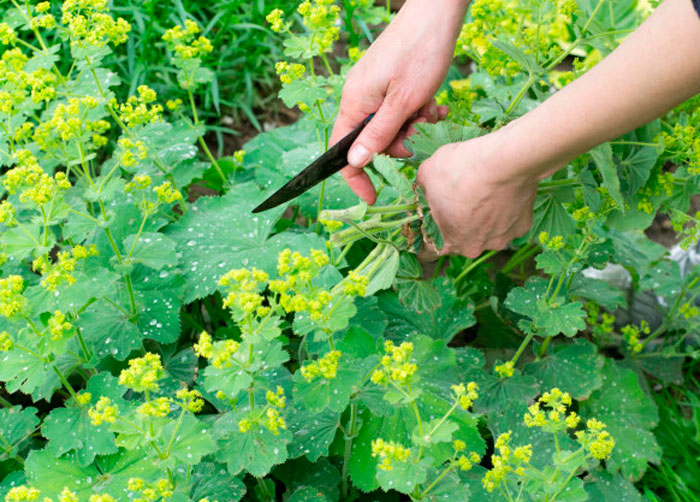Zbierz surowce w czasie kwitnienia krzewów, natychmiast po wyschnięciu porannej rosy na liściach. Odetnij całą nadziemną część rośliny, po czym jest usuwana do wyschnięcia. Aby to zrobić, wybierz miejsce na świeżym powietrzu, które ma niezawodną ochronę przed deszczem i bezpośrednimi promieniami słońca. Całkowicie wysuszony mankiet do przechowywania jest składany w szklanym słoju lub w papierowej torbie. Okres przechowywania wynosi 1 rok.