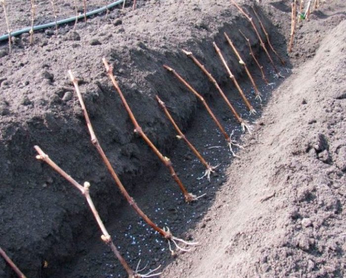 przed sadzeniem winogron 10 litrów gleby wlewa się do środka dołu, aby utworzyć zjeżdżalnię. Roślina jest na niej zainstalowana, a następnie wyprostuj korzenie i wypełnij dziurę żyzną glebą, aż do wzrostu. Jeśli roślina jest krótka, to jest umieszczona pionowo na wzgórzu. A jeśli jest dłuższy niż 25 centymetrów, należy go zainstalować w otworze ukośnie, tak aby pięta była zakopana w glebie na pół metra, a podstawa wzrostu znajdowała się na głębokości 25 centymetrów.