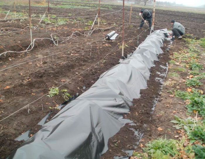 jeśli winorośl jest już dorosła, umieszcza się ją w "tunelu" z folii z tworzywa sztucznego: usuń łodygi z podpór i połóż je na powierzchni gleby, rzuć je świerkowymi gałęziami i zainstaluj łuki szklarniowe z góry, a następnie folia jest na nich rozciągnięta. Aby polietylen nie został zerwany, jego krawędzie są dociskane ciężkimi kamieniami lub rzucane ziemią. Nie zamykaj wyjścia i wejścia tunelu, pozwoli to roślinom stwardnieć, zapewni dobrą wentylację, a dzięki temu niedojrzałe pędy będą miały czas na sen. Jeśli jednak mróz jest silniejszy niż minus 15 stopni, te otwory w tunelu muszą być zamknięte.