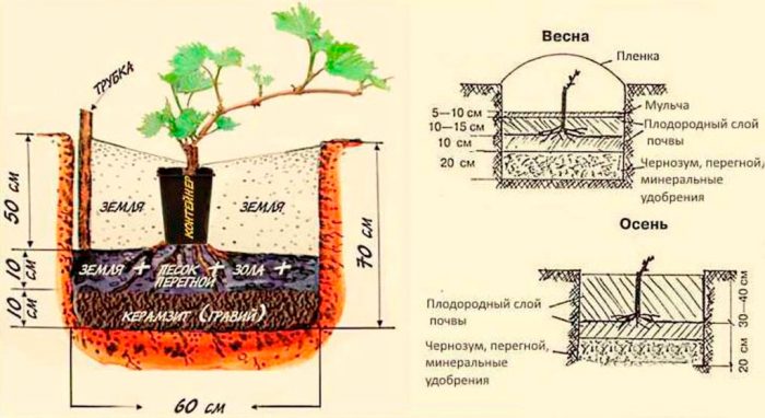 przygotowanie dołów do lądowania zajmuje się wcześniej. Ich wielkość powinna wynosić 50 x 50 x 60 cm, warstwa drenażu o grubości od 50 do 70 mm jest układana na dnie każdego dołu, do tego można użyć kawałków cegły lub kruszonego kamienia. Na drenażu układa się arkusz grubego papieru, a pod ścianą instaluje się rurę drenażową. Będzie stosowany w przyszłości do podlewania i karmienia winogron. Następnie około 20 litrów pożywnej gleby, 10 litrów próchnicy, jedna garść popiołu drzewnego i 1 łyżka powinny być wypełnione do dołu.nitroammofoska. Wszystko dobrze wymieszaj, a następnie wlej tyle gleby do dołu, aby była pełna. Do sadzenia zaleca się stosowanie tylko górnej warstwy odżywczej gleby, która pozostała po przygotowaniu otworów do sadzenia. Przeprowadź obfite podlewanie dołu, w wyniku czego gleba powinna się w nim osiąść. Następnie dół powinien nadal stać przez około pół miesiąca. Natychmiast po przygotowaniu dołu bardzo niepożądane jest sadzenie sadzonki, ponieważ gleba podczas osiadania pociąga korzenie krzewu na dużą głębokość, co prowadzi do ich obrażeń. Doświadczeni ogrodnicy zalecają przygotowanie takich dołów w pierwszych dniach sierpnia. Podczas sadzenia dwóch lub więcej sadzonek między nimi należy zachować odległość co najmniej 100 cm.